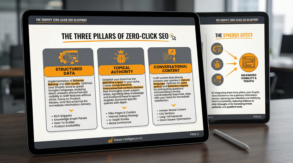 The Shopify Zero-Click SEO Blueprint (PDF): A comprehensive, step-by-step strategy guide detailing our proprietary 3-Pillar System for achieving AI search dominance