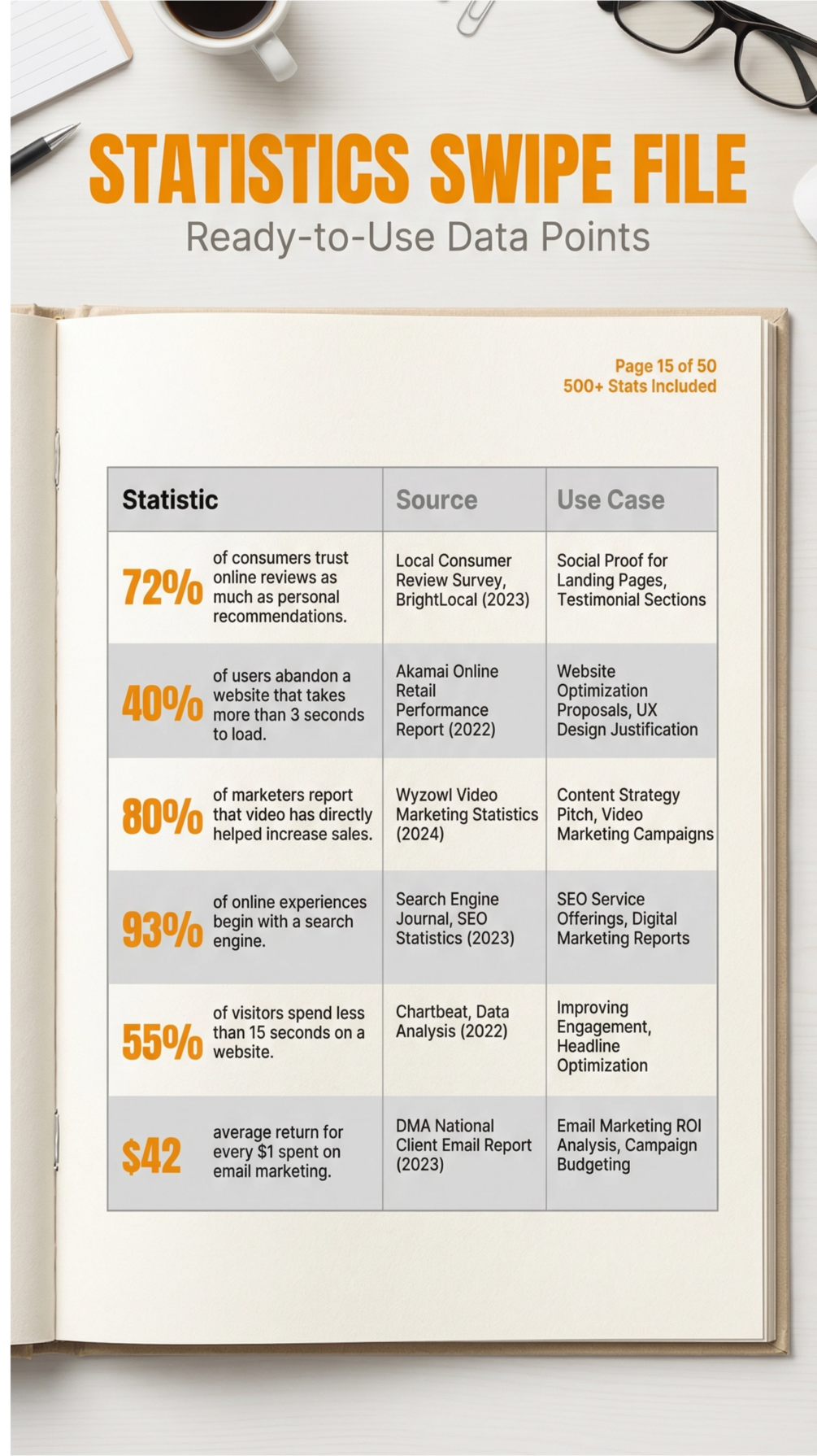 • 500+ Statistics: Ready-to-use swipe file organized by industry and topic.