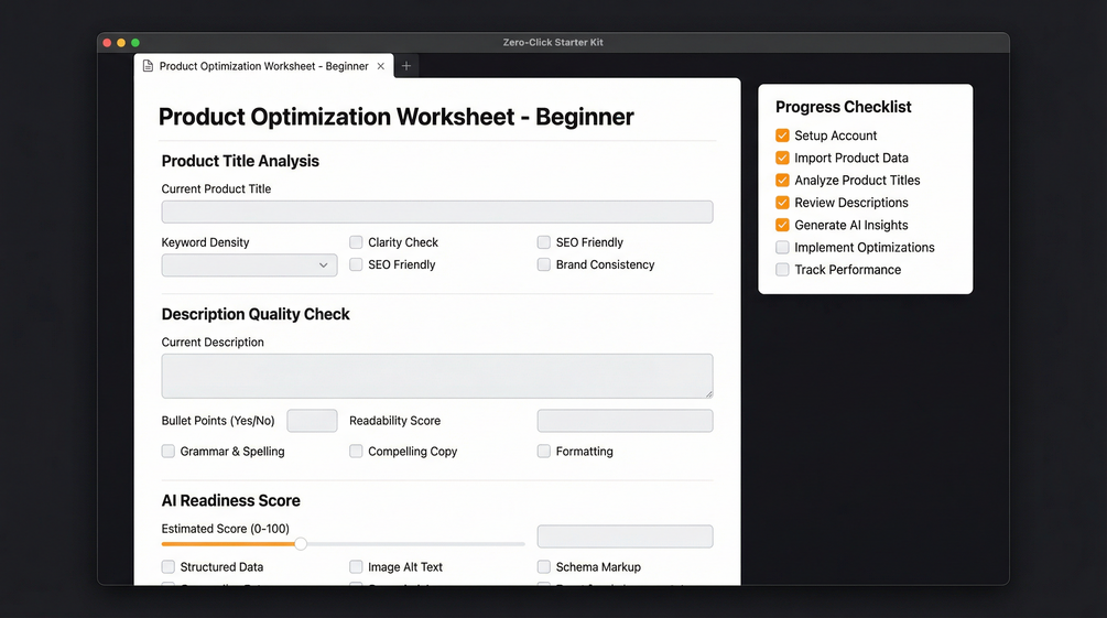 3. **Use the Beginner Worksheets**: Work through the Product_Optimization_Worksheet_Beginner.pdf and Website_Optimization_Checklist_Beginner.pdf to perform a basic audit of your assets.